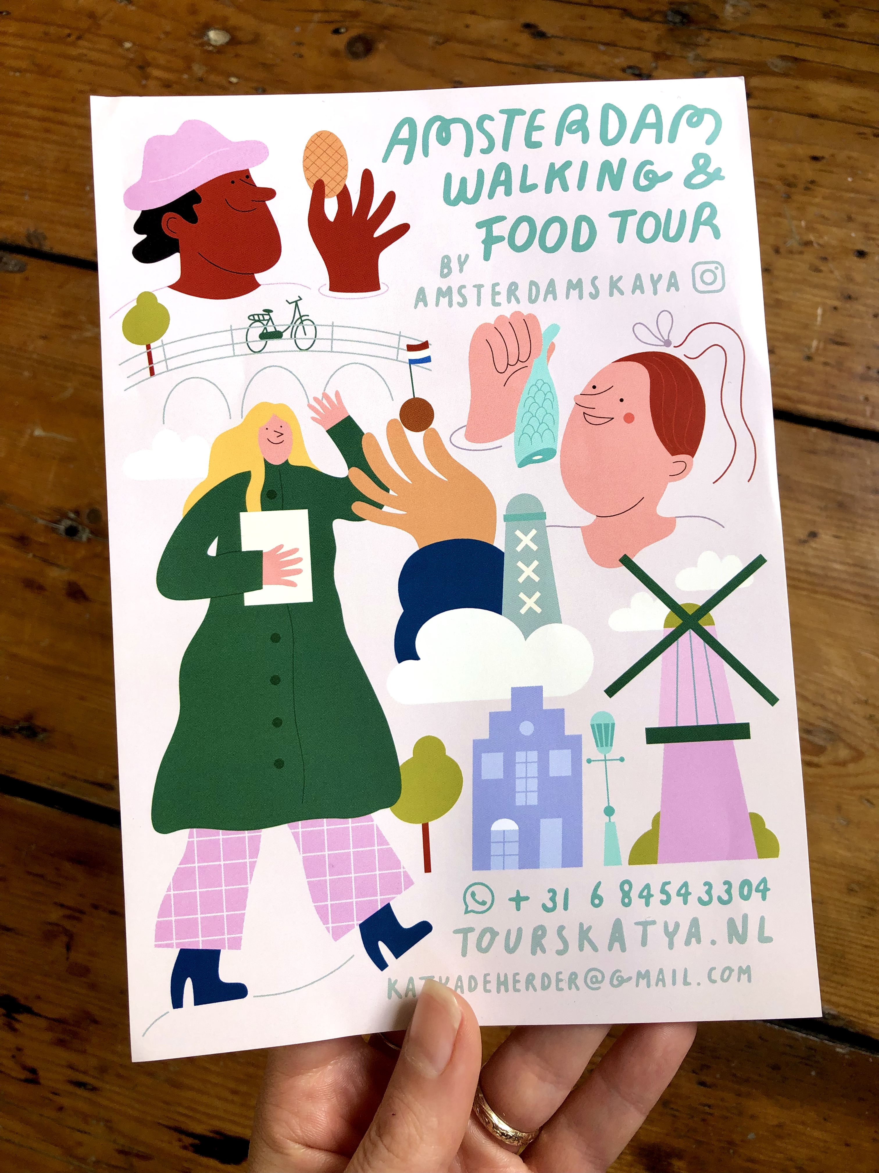 An exciting assignment I i did for Katya, a food tour host in Amsterdam. She asked me to design a flyer and a business card to hand out to her customers. Katya’s tours contain lots of (fun) facts and snacks are provided along the way. I illustrated some typical Dutch snacks and buildings for her merchandise.